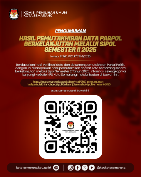 Semarang, kota-semarang.kpu.go.id - Berdasarkan hasil verifikasi data dan dokumen pemutakhiran Partai Politik, dengan ini disampaikan hasil pemutakhiran data dan dokumen Partai Politik tingkat Kota Semarang secara berkelanjutan melalui Sipol Semester 2 Tahun 2025, sebagai berikut: klik di sini ....