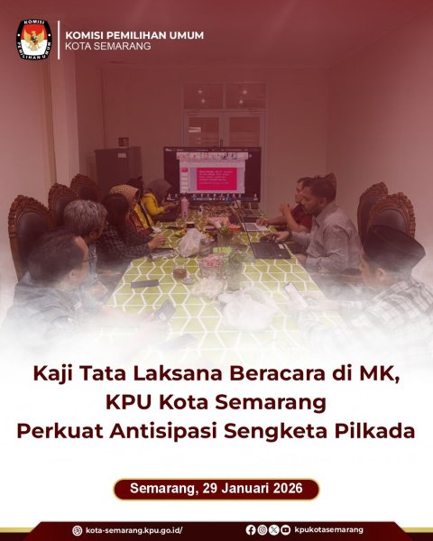 Semarang, kota-semarang.kpu.go.id - Komisi Pemilihan Umum (KPU) Kota Semarang bersama satker KPU se-Jawa Tengah mengkaji tata laksana beracara di Mahkamah Konstitusi (MK) sebagai upaya memperkuat antisipasi terhadap potensi sengketa Pilkada, Kamis (29/1). Kajian tersebut dilaksanakan melalui forum Kamis Sesuatu Seri ke-XXXVII yang diselenggarakan secara daring oleh KPU Provinsi Jawa Tengah dengan tema Putusan Mahkamah Konstitusi di Pilkada 2024: Antara Teknis, Hukum, Politik, dan Dinamika Permasalahan. Forum tersebut menjadi ruang pembelajaran strategis bagi jajaran penyelenggara pemilu untuk memahami kompleksitas putusan MK, tidak hanya dari sisi hukum, tetapi juga dari aspek teknis penyelenggaraan dan dinamika politik yang menyertainya. Kegiatan dibuka oleh Anggota KPU Provinsi Jawa Tengah, Basmar Perianto Amron. Dalam sambutannya, Basmar menegaskan bahwa kajian Kamis Sesuatu yang dilaksanakan secara berkelanjutan berperan penting dalam memperdalam wawasan, menyamakan perspektif, serta memperkuat kapasitas kelembagaan KPU sebagai penyelenggara pemilu yang profesional dan akuntabel. Fokus pembahasan diarahkan pada pembelajaran langsung dari pengalaman praktis penanganan perkara di Mahkamah Konstitusi pada Pilkada 2024. Peserta diajak untuk memahami cara membaca, menganalisis, dan memetakan putusan MK secara komprehensif, sekaligus mengidentifikasi potensi risiko yang dapat muncul pada setiap tahapan pemilihan, sehingga dapat diantisipasi sejak dini. Hadir sebagai narasumber, Hepriyadi, advokat sekaligus mantan Anggota KPU Provinsi Sumatera Selatan periode 2018–2023, serta Yusuf Agung Purnama, advokat. Keduanya memaparkan pengalaman beracara di Mahkamah Konstitusi, termasuk strategi pembuktian, pemetaan isu hukum, serta pentingnya ketelitian administrasi dan kepatuhan prosedur dalam penyelenggaraan pemilihan. Pengantar materi disampaikan oleh Anggota KPU Provinsi Jawa Tengah, Muslim Aisha, yang menekankan pentingnya peningkatan literasi hukum bagi seluruh jajaran KPU guna menjaga integritas proses pemilihan dan kualitas demokrasi. Melalui forum tersebut diharapkan satker se-Jawa Tengah bisa menegaskan komitmennya untuk terus meningkatkan kompetensi sumber daya manusia, memperkuat pemahaman regulasi serta putusan peradilan pemilu, dan memastikan penyelenggaraan Pilkada berjalan profesional, transparan, dan berintegritas. (sof/ed. Foto: dok KPU Kota Semarang) ....
