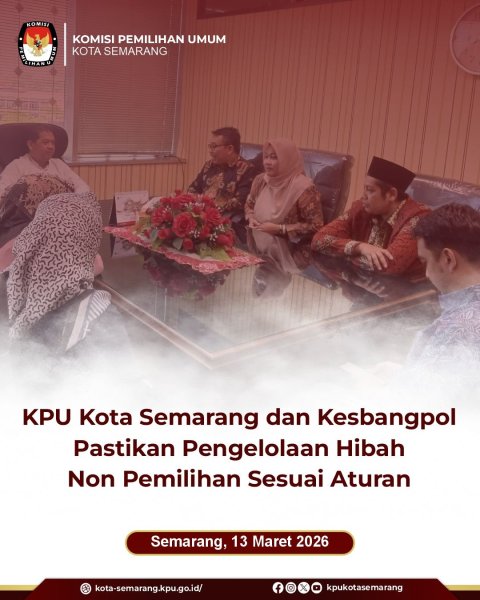 Semarang, kota-semarang.kpu.go.id – Komisi Pemilihan Umum (KPU) Kota Semarang bersama Badan Kesatuan Bangsa dan Politik (Kesbangpol) Kota Semarang memastikan pengelolaan anggaran hibah non pemilihan dilaksanakan sesuai dengan ketentuan peraturan perundang-undangan, Jumat (13/3). Hal itu dibahas dalam pertemuan koordinasi antara kedua lembaga guna menyamakan pemahaman terkait mekanisme pengelolaan hibah daerah. Dalam pertemuan tersebut, kedua pihak membahas berbagai aspek pengelolaan hibah non pemilihan, mulai dari mekanisme penganggaran, proses penyaluran, hingga pertanggungjawaban penggunaan anggaran.  Pembahasan ini dilakukan untuk memastikan setiap tahapan pengelolaan hibah dapat berjalan sesuai prosedur yang berlaku. Selain itu, KPU Kota Semarang dan Kesbangpol Kota Semarang juga menyamakan persepsi mengenai proses administrasi, perencanaan kegiatan, serta penyusunan laporan penggunaan anggaran. Langkah ini diharapkan dapat mendorong pengelolaan anggaran hibah yang tertib, transparan, dan akuntabel. Melalui koordinasi tersebut, KPU Kota Semarang berharap pelaksanaan kegiatan yang didukung oleh anggaran hibah non pemilihan dapat berjalan lebih optimal serta mendukung pelaksanaan tugas dan fungsi kelembagaan secara efektif. (rhd/ed. Foto dok KPU Kota Semarang)