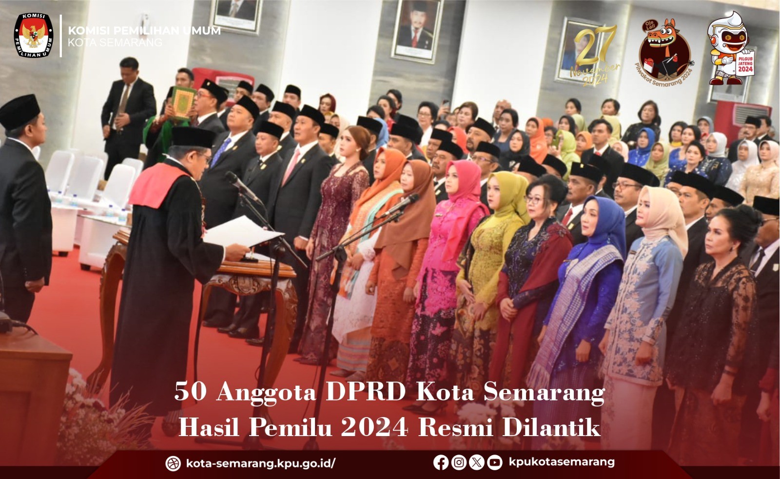 Lima puluh Anggota DPRD Kota Semarang hasil Pemilu 2024 periode 2024-2029 dilantik berdasarkan SK Gubernur Jawa Tengah Nomor 170/104 Tahun 2024 tentang Peresmian Pemberhentian dan Pengangkatan Anggota DPRD Kota Semarang yang dibacakan oleh Sekretaris DPRD Kota Semarang, Moch. Imron.