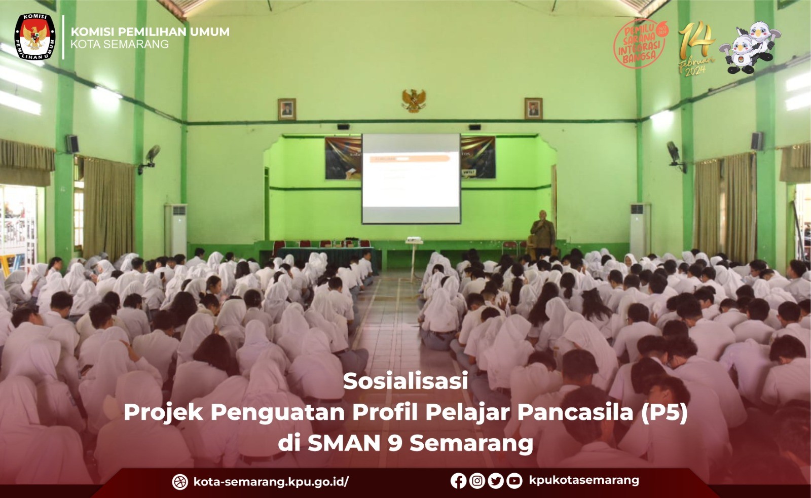 Semarang, kota-semarang.kpu.go.id - Komisi Pemilihan Umum (KPU) Kota Semarang hadiri kegiatan sosialisasi mengenai Pemilu Tahun 2024 melalui Projek Penguatan Profil Pelajar Pancasila (P5) Suara Demokrasi kepada 396 siswa dan siswi pelajar kelas XI SMA Negeri 9 Semarang, Senin (16/10).