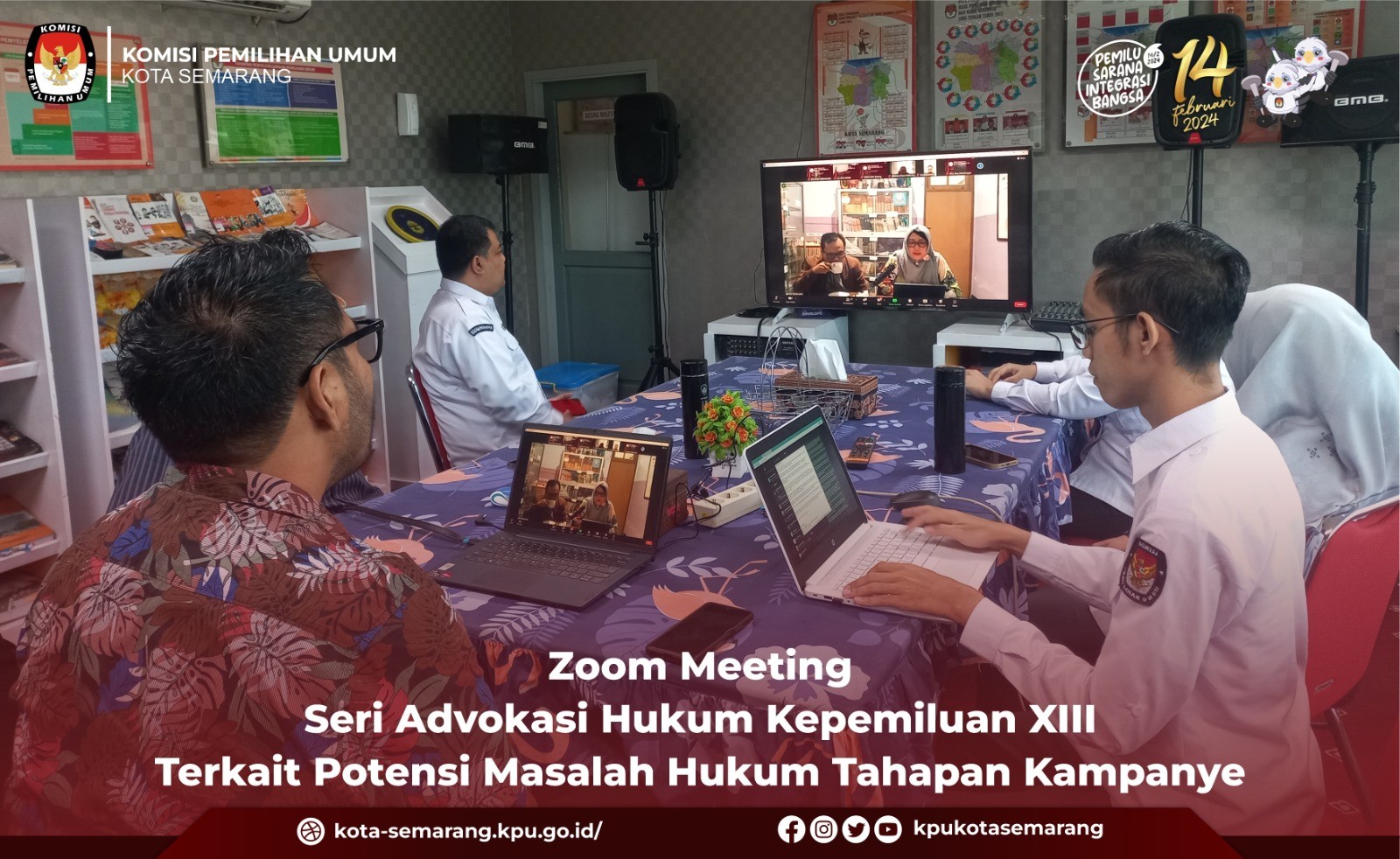 Semarang, kota-semarang.kpu.go.id- Komisi Pemilihan Umum (KPU) Kota Semarang mengikuti kegiatan Zoom Meeting seri Advokasi Hukum Kepemiluan XIII dengan tema Potensi Masalah-Masalah Hukum Terkait Tahapan Kampanye, Kamis (31/8). Kegiatan yang digelar oleh KPU Provinsi Jawa Tengah mengundang Ketua dan Anggota KPU, Sekretaris, serta Kasubbag Hukum dan SDM dan staf dari 35 KPU Kabupaten/Kota di Jawa Tengah. Bertindak sebagai narasumber yaitu Puji Kusmarti, Anggota KPU Kota Surakarta dan Ahmad Nizam Baequni, Anggota KPU Kabupaten Brebes. Kegiatan tersebut dibuka oleh Anggota KPU Provinsi Jawa Tengah, Eni Misdayani yang mengulas tahapan kampanye dalam Pemilu. Dalam arahannya, Eni mengatakan bahwa kegiatan advokasi tersebut merupakan momen yang tepat dan efektif untuk mengkaji dan berdiskusi terkait pelaksanaan tahapan kampanye yang akan berlangsung. "Kegiatan advokasi ini yang diadakan oleh divisi Hukum KPU Provinsi Jawa Tengah merupakan momen yang tepat dan efektif untuk mengkaji dan berdiskusi terkait pelaksanaan tahapan kampanye yang akan berlangsung," kata Eni. Dalam paparannya, Eni menerangkan bahwa pelaksana kampanye Pemilu adalah pihak-pihak yang ditunjuk oleh peserta Pemilu untuk melakukan kegiatan kampanye. Dalam kesempatan tersebut Eni juga memaparkan mengenai landasan hukum kampanye, prinsip-prinsip, serta larangan-larangan dalam kampanye secara garis besar. Narasumber pertama Puji Kusmarti menyampaikan materi mengenai potensi masalah-masalah hukum dalam kampanye. Puji menyampaikan, permasalahan seputar kampanye yang berpotensi terjadi adalah banyaknya pelanggaran oleh peserta Pemilu yang disebabkan karena regulasi atau aturan-aturan tidak dipahami secara detil. "Permasalahan tentang kampanye, utamanya banyaknya pelanggaran oleh peserta Pemilu disebabkan karena regulasi atau aturan-aturan tidak dipahami secara detail," terang Puji. Puji juga mengatakan bahwa kampanye di media sosial juga berpotensi terjadi permasalahan seperti penyebaran informasi bohong, kampanye hitam, isu SARA, dan lain sebagainya. "Permasalahan kampanye di media sosial dengan menyebarkan informasi-informasi bohong, kampanye hitam, isu SARA, dan lain sebagainya," tambah Puji. Narasumber kedua Ahmad Nizam Baequni, anggota KPU Kabupaten Brebes menyampaikan juga potensi permasalahan hukum dalam kampanye seperti pelaksanaan kampanye di masa tenang, pemberitaan dan penyiaran kampanye yang tidak berimbang, keberpihakan pejabat negara dan ASN terhadap peserta pemilu tertentu dan lain sebagainya. Langkah-langkah yang dapat ditempuh untuk mengantisipasi setiap permasalahan hukum yang berpotensi terjadi, Nizam menyampaikan agar KPU kabupaten/kota selalu menjaga koordinasi dengan pengawas pemilu, peserta pemilu serta stakeholder kepemiluan yang lain. "Teman-teman KPU Kabupaten/Kota dapat mengantisipasinya dari sekarang dengan selalu menjaga koordinasi dengan pengawas, peserta pemilu serta stakeholder kepemiluan yang lain dan mencatat seluruh peristiwa dan menyusun kronologi serta menyiapkan dokumen terkait jika terjadi dugaan pelanggaran," terang Nizam. Diakhir sesi, Ketua Divisi Hukum dan Pengawasan KPU Provinsi Jawa Tengah, Muslim Aisha menambahkan terkait pentingnya pemahaman yang utuh mengenai definisi kampanye, masa kampanye, dan istilah-istilah dalam kampanye. Muslim mengajak untuk lebih memahami kembali secara baik dan detail berkaitan dengan kampanye sehingga dapat merespon dan menjawab setiap hal yang muncul dan potensi-potensi yang dapat terjadi selama masa tahapan kampanye. "Saya harap teman-teman KPU Kabupaten/Kota memiliki pemahaman yang lebih utuh, utamanya tentang definisi kampanye serta istilah-istilah lain dalam kampanye, karena merupakan hal yang utama supaya kita bisa menjawab dan merespon setiap hal yang muncul berkaitan dengan dugaan pelanggaran kampanye," tandas Muslim. Hadir dalam kegiatan itu Ketua dan Anggota KPU Kota Semarang serta Kasubbag dan staf Subbag Hukum dan SDM Sekretariat KPU Kota Semarang. (ana/ed. Foto: ina/KPU Kota Semarang)