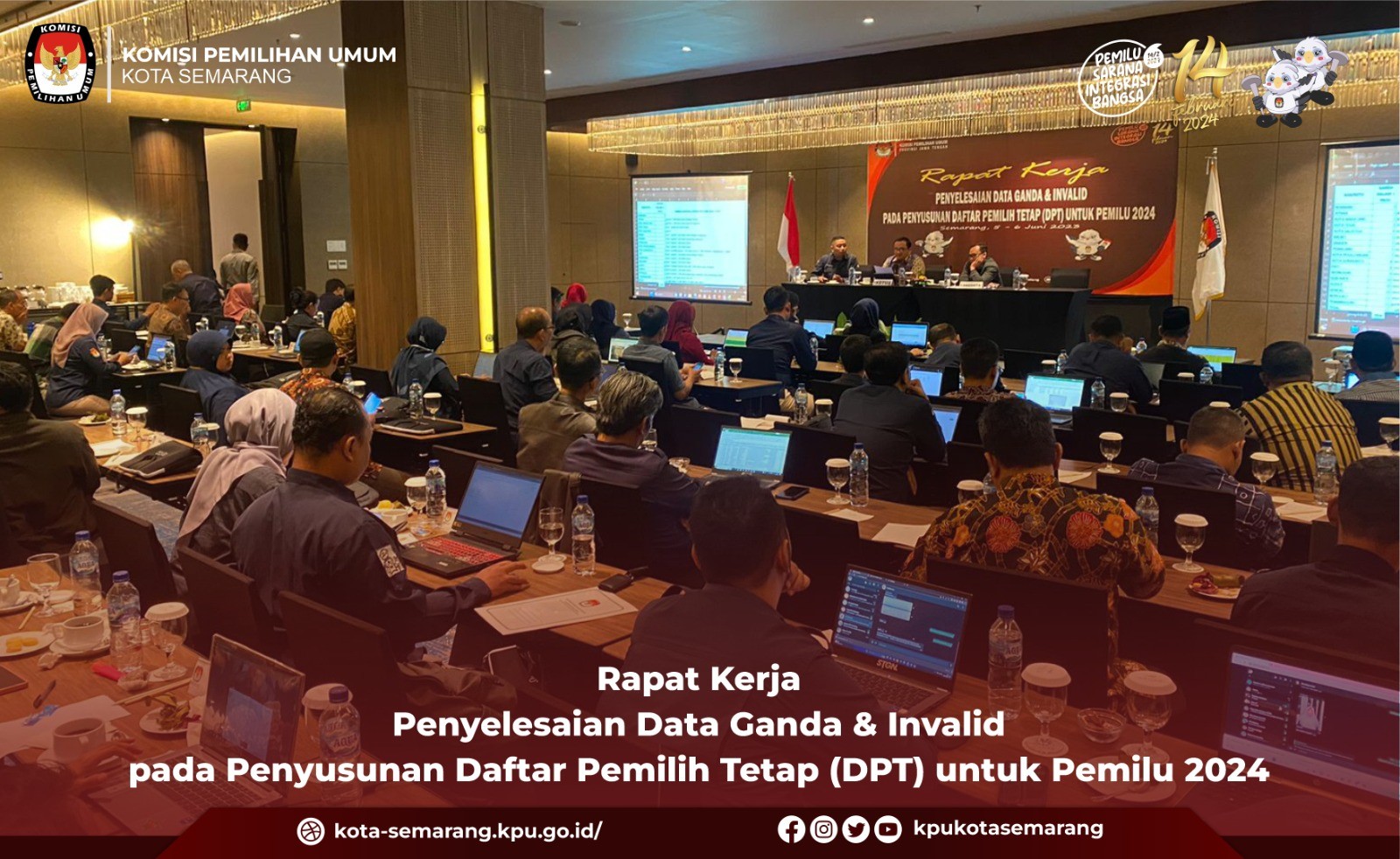 Semarang, kota-semarang.kpu.go.id - Komisi Pemilihan Umum (KPU) Kota Semarang menghadiri Rapat Kerja (Raker) Penyelesaian Data Ganda dan Invalid Pada Penyusunan Daftar Pemilih (DPT) untuk Pemilu 2024, Selasa (6/6). Kegiatan yang digelar oleh KPU Provinsi Jawa Tengah di Hotel Aruss Semarang itu diselenggarakan selama 2 (dua) hari (5 hingga 6 Juni 2023) dengan menggundang Ketua Divisi Data dan Informasi, beserta Operator Sidalih seluruh Jawa Tengah, serta dihadiri Bawaslu Provinsi Jawa Tengah. Dalam pembukaan dan arahannya, Ketua KPU Provinsi Jawa Tengah Paulus Widiyantoro menjelaskan mengenai Penyusunan Daftar Pemilih Tetap (DPT). “Pada pelaksanaan Penyusunan DPT pada Pemilu Tahun 2024 agar cermat meneliti setiap data-data yang masuk dan yang harus diperbaiki, khususnya untuk data ganda di jawa tengah untuk hari ini," kata Paulus. Terkait data ganda yang ada dalam Provinsi Jawa Tengah, Paulus meminta kepada KPU kabupaten/kota agar dapat menyelesaikan proses tersebut sebelum DPT ditetapkan. "Ganda antara kabupaten/kota yang ada di Jawa Tengah harus segera eksekusi dan dikurangi, jika memang terditeksi 1 NIK digunakan lebih dari 1 orang untuk dilengkapi data dukungnya (KK dan KTP) yang bersangkutan, apalagi nantinya data akan di tabrakan dengan provinsi lain di Indonesia, bila perlu untuk bisa di video," tegasnya. Lebih lanjut, Anggota KPU Provinsi Jawa Tengah, Henry Wahyono menegaskan tentang analisa NIK ganda dan invalid pada pemutakhiran daftar pemilih untuk Pemilu 2024. “Pada analisa nik ganda dan invalid yang bapak/ibu temukan di lapangan mohon agar dapat bersurat melaporkan kepada Dukcapil di masing-masing kabupaten/kota, sehingga akan dilakukan perbaikan data kependudukannya dan mempersiapkan pula data dukung yang bersangkutan untuk memperkuat argumen kita terhadap kegandaan dengan tempat lain," kata Henry. Dalam akhir kegiatan ini dilakukan forum diskusi dengan peserta terkait rencana tindak lanjut dan catatan perbaikan dalam proses penyusunan DPT. (yts/ed. Foto: yts/KPU Kota Semarang)