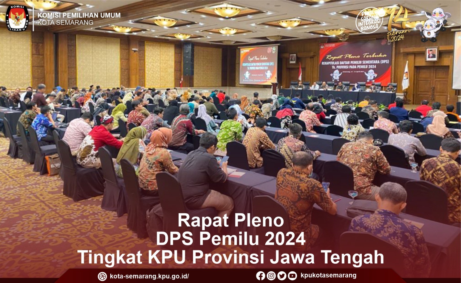 Semarang, kota-semarang.kpu.go.id - Komisi Pemilihan Umum (KPU) Kota Semarang menghadiri Rapat Pleno Terbuka Rekapitulasi Daftar Pemilih Sementara (DPS) Tingkat Provinsi Jawa Tengah untuk Pemilu Tahun 2024, di Hotel Patra Semarang & Convention, Semarang, Jumat (14/4). Sebelum menggelar pleno DPS, KPU Provinsi Jawa Tengah dan KPU kabupaten/kota se Jawa Tengah juga melakukan Rapat Sinkronisasi dan Validasi Daftar Pemilih Sementara (DPS). Kegiatan tersebut diselenggarakan selama dua hari (14 hingga 15 April 2023) menggundang Ketua Divisi Data dan Informasi dan Operator Sidalih dari 35 Kabupaten/kota se Jawa Tengah, serta dihadiri Jajaran Stakeholder, Bawaslu Jawa Tengah, media massa dan partai politik. Dalam pembukaan dan arahannya, Ketua KPU Provinsi Jawa Tengah, Paulus Widiyantoro menjelaskan mengenai TPS di Lokasi Khusus yang merupakan sesuatu hal baru dalam pemilu 2024 ini. “Pada pelaksanaan penyusunan daftar pemilih pada Pemilu Tahun 2024 khususnya DPS, terdapat hal baru yakni TPS di Lokasi Khusus yang merupakan sesuatu hal baru dalam Pemilu 2024," kata Paulus. Terkait TPS di Lokasi Khusus, Paulus menambahkan, kategori-kategori yang dapat dibuat dan fokus dalam pembuatan TPS di Lokasi Khusus. "TPS di Lokasi Khusus meliputi kategori meliputi, rumah tahanan/lapas, panti sosial/rehabilitasi, relokasi bencana, daerah konflik, dan lokasi lainnya seperti pemilih yang terkonsentrasi di suatu tempat," ujar Paulus. Sementara itu, Ketua Divisi Data dan Informasi KPU Provinsi Jawa Tengah, Henry Wahyono membacakan hasil rekapitulasi Daftar Pemilih Sementara di Jawa Tengah. “Rekapitulasi DPS pada Pemilu 2024 dengan jumlah pemilih sebanyak 28.432.762 yang tersebar di 117.298 TPS, di 35 kabupaten/kota di Jawa Tengah," kata Henry. Dalam akhir kegiatan ini dilakukan forum diskusi dengan peserta terkait rencana tindak lanjut dan catatan perbaikan dalam penyusunan daftar pemilih pasca ditetapkannya DPS. Dari diskusi tersebut memunculkan isu diantaranya perlunya ketelitian dan kecermatan terkait penyusunan daftar pemilih ke depannya atau dapat juga melibatkan pemantau dalam pelaksanaan penyusunan daftar pemilih. (yts/ed. Foto: yts/KPU Kota Semarang)