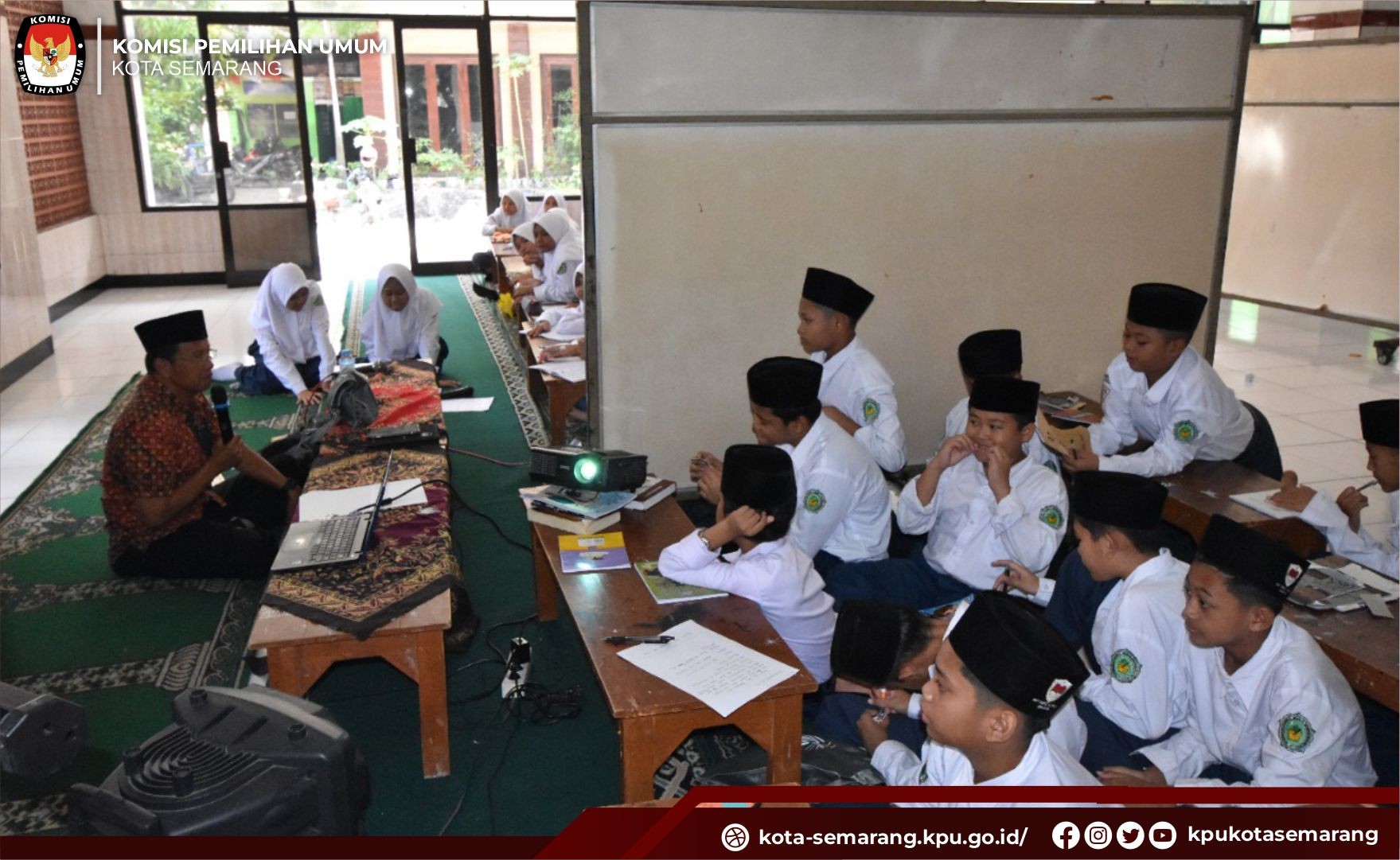 Semarang, kota-semarang.kpu.go.id - Komisi Pemilihan Umum (KPU) Kota Semarang, memberikan materi pemahaman dasar demokrasi kepada siswa SMP Al Hikmah Pedurungan Semarang, Senin (31/10). Materi tersebut disampaikan oleh Anggota KPU Kota Semarang Divisi Teknis Penyelenggaraan, Heri Abriyanto. Heri mengajak siswa SMP Al Hikmah memahami dan belajar tentang bagaimana demokrasi diterapkan di sekolah. Kala itu Heri menerangkan demokrasi di sekolah tercermin dari kegiatan pemilihan ketua OSIS, bagaimana dinamika pemilihan ketua OSIS, pemilihan ketua kelas, sampai dengan bagaimana kebebasan berpendapat antar siswa. “Di sekolah kita bisa mengembangkan kemampuan-kemampuan yang diperlukan untuk bisa berpartisipasi secara cerdas dan sehat dalam proses demokrasi. Sekolah bisa mengembangkan kemampuan yang diperlukan itu di ruang-ruang kelas melalui pembelajaran dalam interaksi antara guru dan murid ketika berdiskusi tentang materi pelajaran serta interaksi antarmurid dalam kegiatan-kegiatan ekstra kurikuler dan organisasi siswa intra sekolah (OSIS)," tegas Heri. Demokrasi di sekolah tercermin dalam suasana yang terbuka dan mendorong siswa untuk berani mempunyai pendapat, berani berpikir sendiri dan menyuarakannya. Hal ini idealnya terjadi di semua mata pelajaran, tetapi khususnya di mata pelajaran Pancasila dan Kewarganegaraan (PPKn) yang idealnya menjadi sumber utama pembelajaran demokrasi di sekolah. Puluhan siswa SMP Al Hikmah menyimak dan aktif berinteraksi terkait materi demokrasi yang disampaikan oleh Heri Abriyanto. Fitriyah dan Mahmudah (Guru SMP Al Hikmah) mengatakan bahwa SMP Al Hikmah Pedurungan bersyukur bahwa KPU bisa secara aktif memberikan pelajaran demokrasi yang mendasar di sekolah. “Materi demokrasi di SMP Al Hikmah menjadi semacam warming up atau pemanasan kepada anak-anak untuk lebih memahami dan mengetahui demokrasi lebih lanjut kedepannya” kata Fitriyah. (dr/ed. Foto: dr/KPU Kota Semarang)