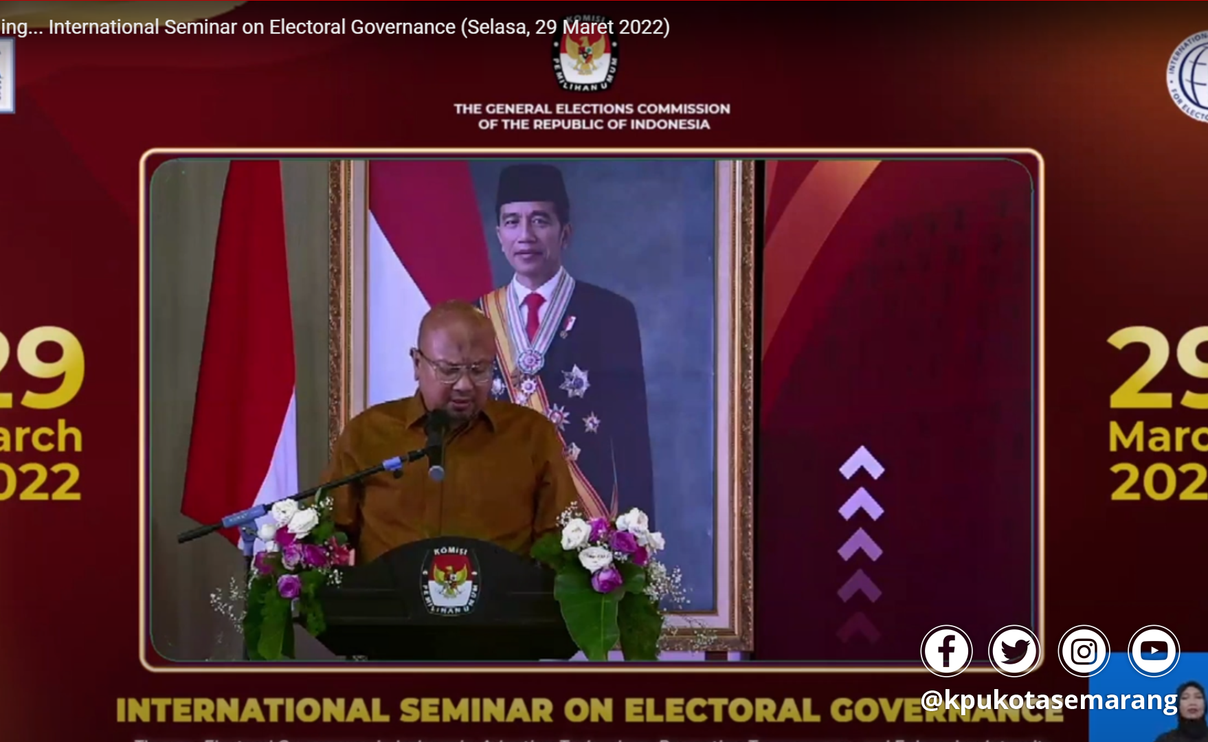 KPU Kota Semarang ikuti Seminar Internasional Tata Kelola Pemilu. Selasa Siang (29/3) KPU Kota Semarang mengikuti Seminar Internasional Tata Kelola Pemilu yang diselenggarakan oleh Komisi Pemilihan Umum Republik Indonesia (KPU RI). Acara bertajuk Electoral Governance in Indonesia, Adopting Technology, Promoting Transparency and Enhancing Integrity, berlangsung live di kanal youtube KPU RI. Hadir memberikan sambutan (Welcoming Remarks) Ketua KPU RI Ilham Saputra, Senior Elections Advisor IFES, Paul Guerin, Regional Director, Asia and the Pasific, International IDEA Leena Rikkila Tamang. Menghadirkan Pembicara Abdul Gaffar Karim (Akademisi UGM), Therese Pearce Laanela (Head of Electoral Processes International IDEA) dan Joanne McCallum (Senior Election Administration IFES). Bertindak sebagai Moderator, Hadar Nafis Gumay (Executive Director NETGRIT). Hadir Komisioner KPU RI, Ilham Saputra, I Dewa raka Sandi dan Evi Novida Ginting, Sekretaris Jenderal KPU RI Bernad Dermawan Sutrisno dan jajaran sekretariat KPU RI, serta undangan dari dalam dan luar negeri. Tantangan tahapan pemilu di Indonesia yang kompleks dengan ribuan pulau, bahasa dan juga kondisi geografi. Antara lain pemutakhiran data pemilih, pemetaan dapil, pengaturan lokasi kampanye, logistik dan persiapan pemungutan dan penghitungan suara. Pengaruhnya sangat besar bagi pemilu di Indonesia. Pemanfaatan teknologi informasi sangat penting untuk mendukung semua tahapan tersebut bisa berjalan dengan lancar. KPU sebagai penyelenggara pemilu dan pemilihan serentak memiliki tugas melaksanakan semua jenis pemilihan. KPU berkomitmen mengutamakan keterbukaan dan integritas dalam proses penyelenggaraannya. 190 juta pemilih dalam negeri dan 2 juta pemilih di luar negeri. KPU melaksanakan pemilu dan pemilihan serentak dengan matang membuat regulasi, membentuk penyelenggara, pendaftaran dan penetapan peserta, logistik, pemungutan dan penghitungan suara. Penggunaan teknologi informasi untuk proses pemilu yang dilaksanakan diluar negeri adalah pendaftaran pemilih secara daring dan penggunaan barcode bagi pemilik C6. Pada pemilu dan pemilihan serentak 2024, KPU menyiapkan sistem informasi untuk mendukung tahapan yaitu lindungi hakmu, membantu masyarakat mengecek namanya, Sipol, Silon, Silog,Sirekap. Indonesia akan menorehkan sejarah akan menggelar pemilu dan pemilihan serentak dalam tahun yang sama. KPU berkomitmen pemilu dan pemilihan serentak 2024 berlangsung lancar aman tertib dan damai. Seminar Internasional mendiskusikan bagaimana mengadopsi teknologi untuk tranparansi pelaksanaan pemilu dan menciptakan pemilu yang berintegritas. (Didin R)