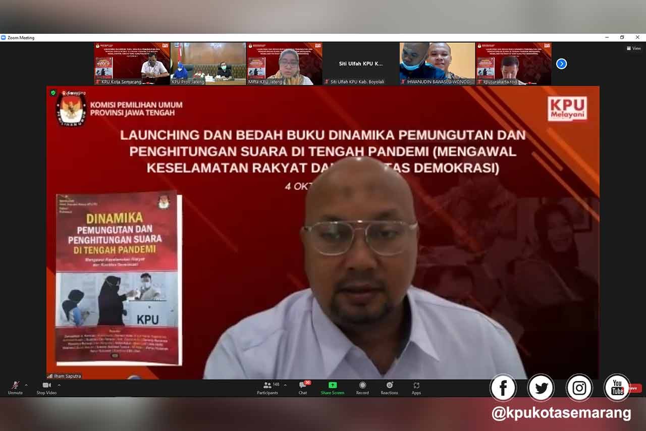 Narasumber utama adalah Titi Angraeni SH MH (Anggota Dewan Pembina Perludem) bertindak sebagai moderator Dr. Ferry Daud Liando (Akademisi dari Unisrat). Pada sambutannya, Ketua KPU Jawa Tengah Yulianto Sudrajat menyampaikan selamat atas kerja keras sehingga buku dinamika pemungutan dan penghitungan suara di tengah pandemi dengan judul Mengawal Keselamatan Rakyat dan Kualitas Demokrasi, bisa terbit dan launching. Menurutnya ini adalah sebuah catatan perjalanan mengawal proses pilkada 2020, secara umum dan mengawal pilkada 2020 yang sifatnya teknis mulai pra pemungutan, pemungutan sampai pasca pemungutan suara.
