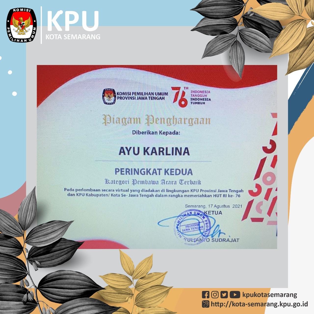 Semarang, https://kota-semarang.kpu.go.id Senin (16/8). KPU Kota Semarang mengikuti diskusi daring dengan tema“Strategi Pengembangan Sosialisasi dan Pendidikan Pemilih Melalui Digitalisasi Pemilu 2024" yang diselenggarakan oleh KPU Kabupaten Morowali Utara. Webinar diikuti oleh seluruh Ketua dan Anggota Divisi SDM, Sosdiklih KPU Kabupaten/Kota se Jawa Tengah, Provinsi Riau, dan Provinsi Sulawesi Tengah.