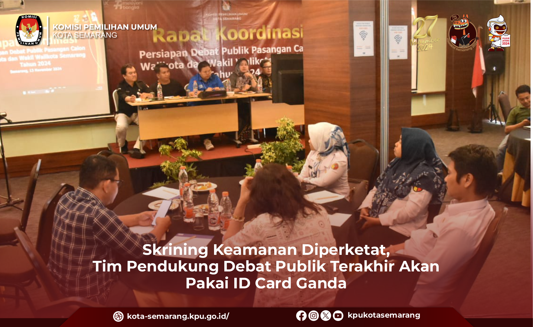 Semarang, kota-semarang.kpu.go.id - Sebagai langkah antisipasi terhadap risiko kerawanan pada debat publik ketiga untuk paslon Pilwakot Semarang 2024, masing-masing tim pendukung paslon akan mengenakan id card ganda, Rabu (13/11). Selain mengenakan id card berupa lanyard, 100 pendukung paslon yang akan masuk dalam ballroom debat diharuskan memakai gelang sebagai skrining ganda. Hal itu merupakan langkah evaluasi yang diterapkan oleh penyelenggara karena pada debat sebelumnya ada indikasi jumlah pendukung yang masuk dalam ballroom lebih dari jumlah yang ditentukan. "Kami evaluasi dari debat sebelumnya dan juga masukan untuk meningkatkan keamanan, nanti di debat ketiga akan diterapkan dua id card, satu berupa id card biasa yang dikalungkan, dan untuk antisipasi apabila id itu diserahkan ke orang lain, maka nanti ditambah ada gelang seperti konser itu," kata tim penyelenggara debat ketiga, TVKU. Cara tersebut dinilai lebih baik untuk menghindari penggunaan id oleh orang lain yang tidak seharusnya masuk dalam ballroom debat. "Id card kalung akan diberikan sehari sebelum pelaksanaan debat, nah untuk yang berupa gelang akan diberikan sebelum tim masuk dalam venue, kita yang akan memakaikan, agar tidak disalahgunakan," lanjut tim penyelenggara. Dalam ballroom dan venue kegiatan debat, tim pendukung juga diharuskan memakai id card ganda untuk menjaga keamanan dan ketertiban selama debat berlangsung. "Jadi nanti mohon agar, bapak/ibu semua tetap mengenakan id card berupa kalung dan juga gelang. Agar selama pelaksanaan debat bisa aman dan tertib," sambungnya. Sementara itu, Anggota KPU Kota Semarang Divisi Sosparmas dan SDM, Novi Maria Ulfah mengatakan, debat publik ketiga yang akan digelar pada Jumat 15 November 2024 adalah pelaksanaan debat pamungkas. "Debat ketiga nanti menjadi debat publik penutup, karena sudah tidak ada lagi debat publik yang akan dilaksanakan oleh KPU Kota Semarang," ujar Novi. Oleh sebab itu, ia berharap seluruh pihak terkait bisa menjaga kondusifitas kegiatan, sehingga masyarakat Kota Semarang mendapatkan informasi dan manfaat sebaik-baiknya. "Kami berharap semua bisa bersama-sama menjaga ketertiban debat semua berjalan lancar dan aman, dan juga yang terpenting dari tujuan debat ini, yakni agar masyarakat bisa mendapat manfaat, bisa lebih mengenal paslon dan visi misi yang diusung," papar Novi. Debat publik ketiga akan mengusung tema Pendidikan, Kesehatan, Sosial dan Budaya Kota Semarang. Tema tersebut akan dijabarkan dalam lima sub tema. Kelima sub tema tersebut yakni pendidikan, kesehatan dan gender, kependudukan dan pemukiman, kebudayaan dan pariwisata, sosial keagamaan. Masing-masing sub tema akan berisi dua pertanyaan yang disusun oleh tim panelis. Sehingga pada debat publik ketiga, total akan ada 10 pertanyaan yang akan dielaborasi oleh masing-masing paslon. Berdasarkan hasil evaluasi pelaksanaan debat kedua, Kabag Ops Polrestabes Semarang, AKBP Asep Supiyanto mengatakan debat tersebut sudah lebih baik ketimbang debat pertama. Meski demikian menurutnya pada debat ketiga perlu ditingkatkan keamanan, dan ketertiban masa. Terutama pasca pelaksanaan debat, saat masing-masing pendukung dan paslon meninggalakan lokasi acara. Kegiatan Rapat Koordinasi Persiapan Debat Ketiga yang digelar di Holiday Inn Express tersebut dihadiri oleh Anggota KPU Kota Semarang, masing-masing tim pendukung dan LO paslon, Bawaslu Kota Semarang, TVKU, Patra Jasa Hotel, dan Polrestabse Semarang. (rap/ed. Foto: div/sim/KPU Kota Semarang)