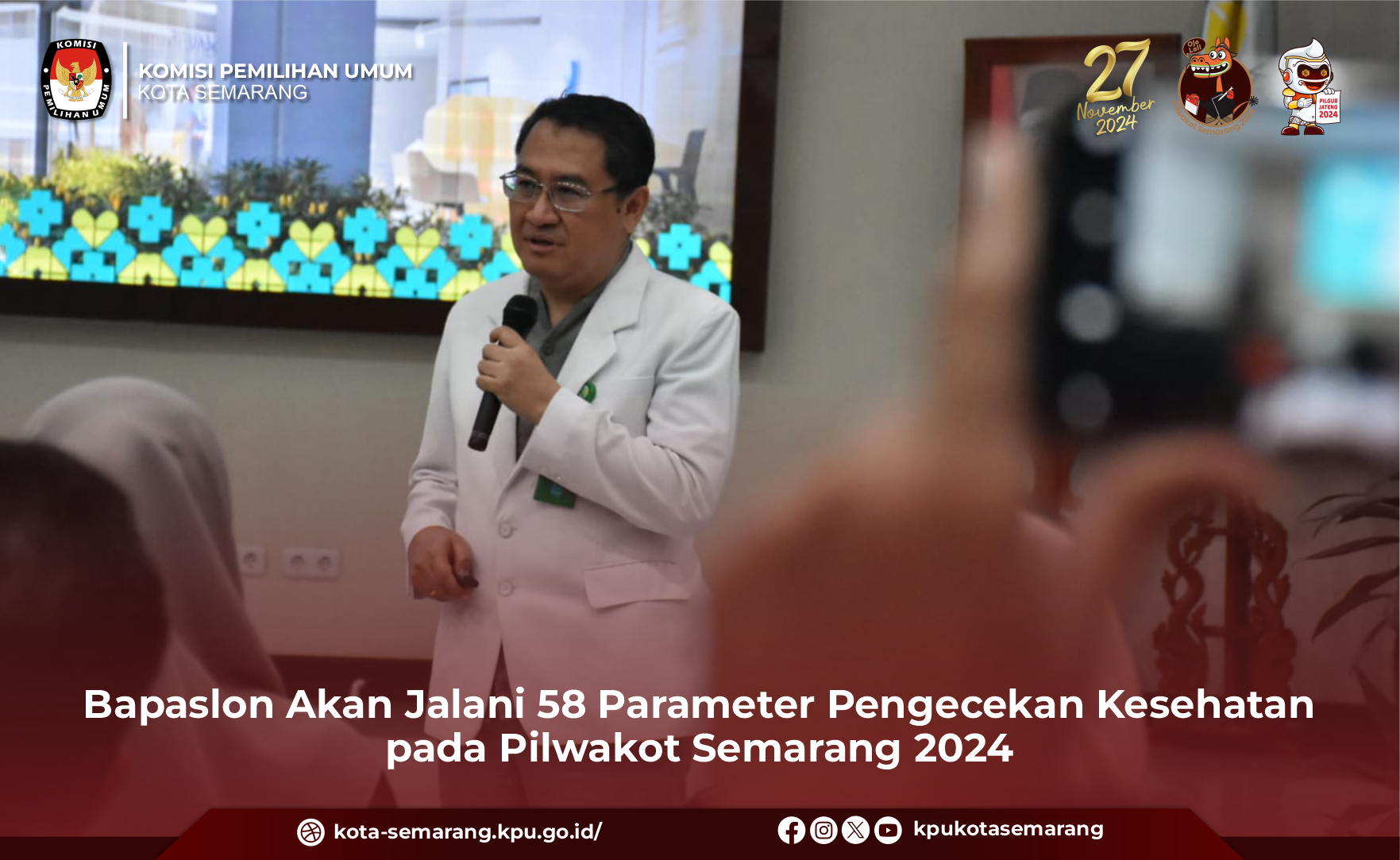 Semarang, kota-semarang.kpu.go.id - Rumah Sakit Umum Pemerintah (RSUP) Dr. Kariadi Semarang akan menjadi rumah sakit yang berwenang melaksanakan serangkaian tes kesehatan untuk memeriksa kelayakan bakal pasangan calon di Pemilihan Wali Kota dan Wakil Wali Kota Semarang Tahun 2024, Senin (26/8). Hal tersebut ditetapkan setelah Kemenkes melalui RS Dr. Kariadi dan Komisi Pemilihan Umum (KPU) Kota Semarang melakukan penandatanganan Perjanjian Kerja Sama (PKS) dengan Nomor 1124/PL.02.2-PKS/3374/2/2024 tentang Pemeriksaan Kesehatan Bakal Pasangan Calon Wali Kota dan Wakil Wali Kota Semarang Tahun 2024. Dalam penyampaian mekanisme pemeriksaan kesehatan yang diucapkan oleh Ketua Tim Pemeriksa RS Dr. Kariadi, Dr. Thomas Handoyo, Sp. PD. KP., FINASIM. dijelaskan bahwa tim pemeriksa kesehatan untuk Pilkada 2024 berjumlah lebih dari 60 orang. "Nanti untuk Pilkada 2024 ini ada lebih dari 60 dokter spesialis konsultan yang bertugas," kata Thomas. Thomas menjelaskan, tim yang bertugas untuk melaksanakan pemeriksaan kesehatan bakal pasangan calon di Pilkada 2024 adalah orang-orang yang sudah dilakukan seleksi oleh Direktur RSUP Dr, Kariadi. Ia juga memastikan bahwa tim yang dipilih tersebut tidak memiliki afiliasi dengan parpol maupun bakal pasangan calon yang berkompetisi di Pilkada 2024. "Kami memastikan bahwa seluruh dokter spesialis konsultan dan tim yang dibentuk ini tidak memiliki afiliasi dengan parpol, paslon, dan tidak sebagai dokter pribadi bakal paslon manapun," sambung Thomas. Hadir dalam penandatanganan tersebut, Ketua, Ahmad Zaini, Anggota, Agus Supriyono dan Novi Maria Ulfah, Sekretaris, Tobirin, dan Plt. Kasubbag Sosparmas dan SDM sekaligus sebagai Pejabat Pembuat Komitmen (PPKom) Sekretariat KPU Kota Semarang, Riza Setiawan. (rap/ed. Foto: rap/KPU Kota Semarang)
