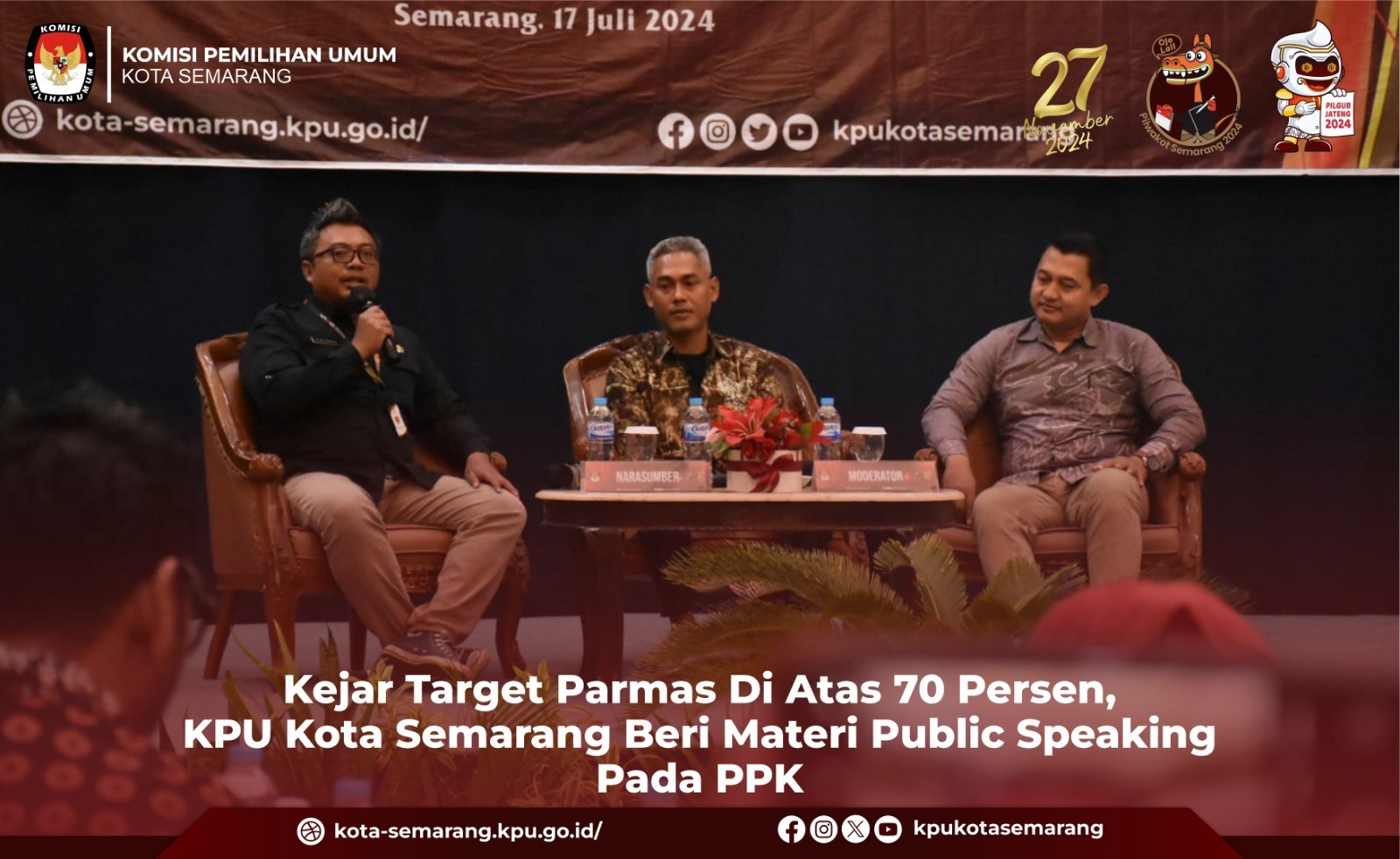Semarang, kota-semarang.kpu.go.id - Komisi Pemilihan Umum (KPU) Kota Semarang berupaya mendekati target partisipasi pemilih di atas 70 persen pada Pilkada 2024 dengan cara memberikan materi public speaking kepada Panitia Pemilihan Kecamatan (PPK) se-Kota Semarang, Rabu (17/7).