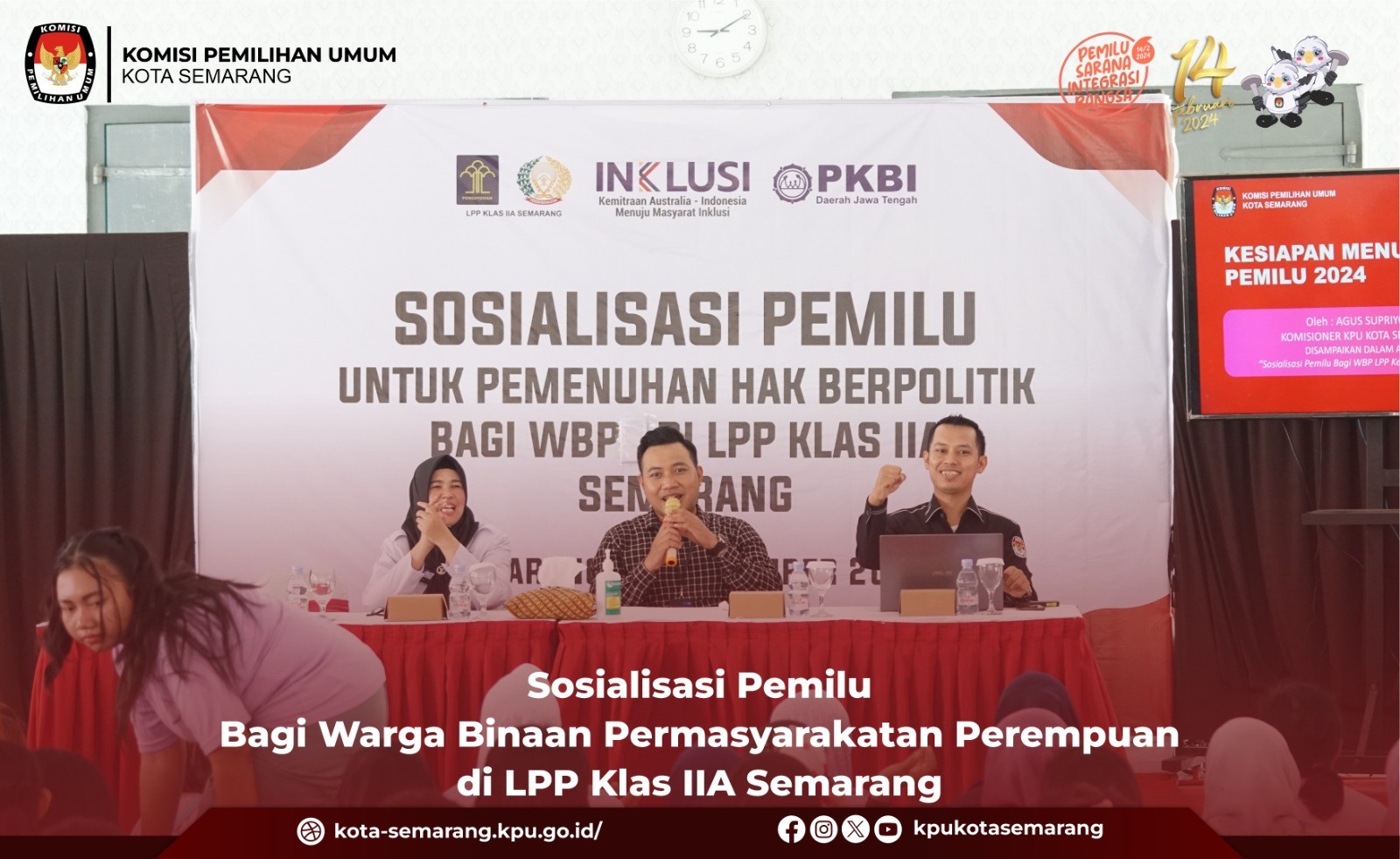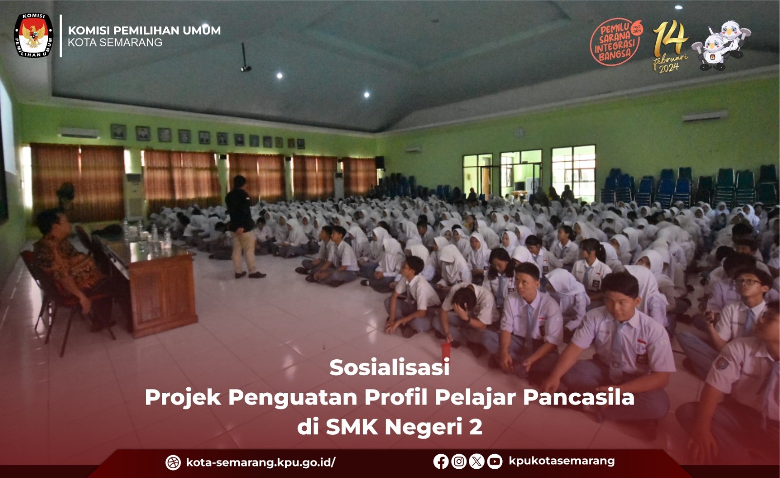 Semarang, kota-semarang.kpu.go.id - Komisi Pemilihan Umum (KPU) Kota Semarang berikan sosialisasi kepada para pelajar SMK Negeri 2 Semarang melalui kegiatan Suara Demokrasi, Rabu (15/11). Hadir sebagai narasumber dalam kegiatan tersebut Anggota KPU Kota Semarang, Ahmad Zaini. Zaini menjelaskan bahwa Indonesia sudah melalui banyak masa-masa Demokrasi, baik dari awal-awal Bangsa Indonesia berdiri, terbentuknya Sistem Demokrasi Parlementer, keluarnya Dekrit Presiden 5 Juli 1959, Demokrasi Pancasila era Orde Baru, hingga Demokrasi Pancasila era Reformasi. Pentingnya Demokrasi bagi bangsa Indonesia adalah untuk mengembangkan dan menyalurkan bermacam-macam kepentingan warga negara dan juga wadah untuk memecahkan persoalan bersama. Zaini menambahkan, penyelenggaraan Pemilu di Indonesia menggunakan azas LUBER JURDIL, Langsung, Umum, Bebas, Rahasia, Jujur, dan Adil. Hal itu Tertuang dalam Pasal 2 UU No 7 Tahun 2017. "Azas itu memberikan rasa aman karena dilaksanakan secara langsung, umum, bebas, rahasia, jujur, dan adil, khususnya untuk pemilih pemula," kata Zaini. Zaini juga menghimbau bagi para siswa yang sudah 17 Tahun dan memiliki KTP berhak memberikan suaranya, untuk masa depan Bangsa Indonesia 5 tahun ke depan. "Jadi bagi teman-teman yang sudah berumur 17 tahun atau sudah memiliki hak pilih, harus menggunakan hak pilihnya besok Rabu, 14 Februari 2024 ya. Karena suara teman-teman semua memiliki arti yang penting untuk menentukan masa depan bangsa," pesan Zaini. (if/ed. Foto: if/KPU Kota Semarang)