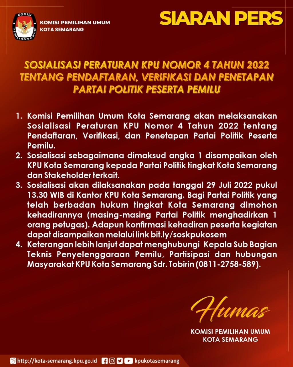 Pengumuman KPU Kota Semarang Nomor 1054/PP.04.1-Pu/3374/2022 tentang Ralat Pengumuman Nomor 1041/PP.04.1-Pu/3374/2022 tentang Seleksi Calon Anggota Panitia Pemilihan Kecamatan untuk Pemilihan Umum Tahun 2024