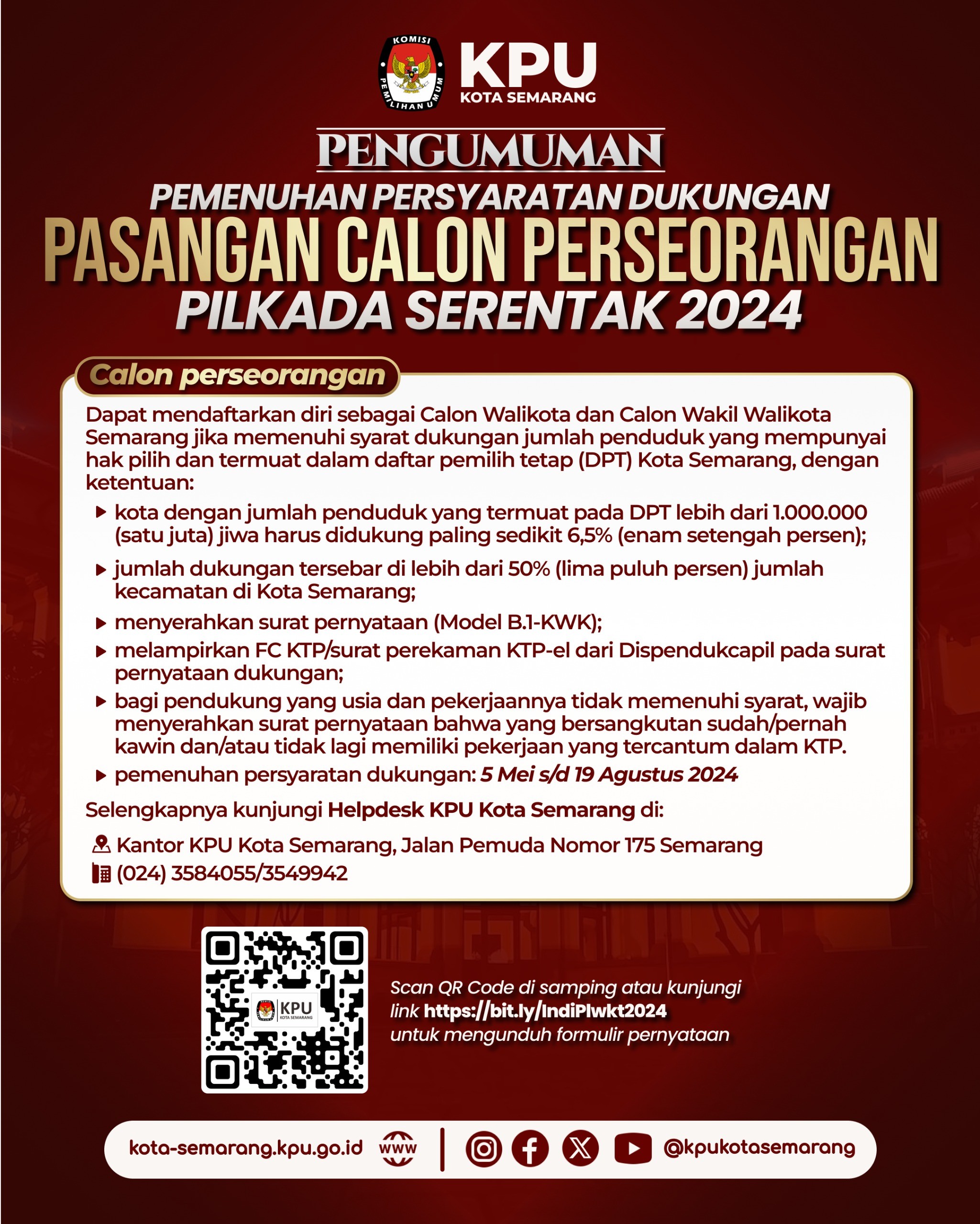 Selengkapnya kunjungi Helpdesk KPU Kota Semarang di Kantor KPU Kota Semarang, Jalan Dr Cipto Nomor 115 Semarang, email: kpukota.smg@gmail.com